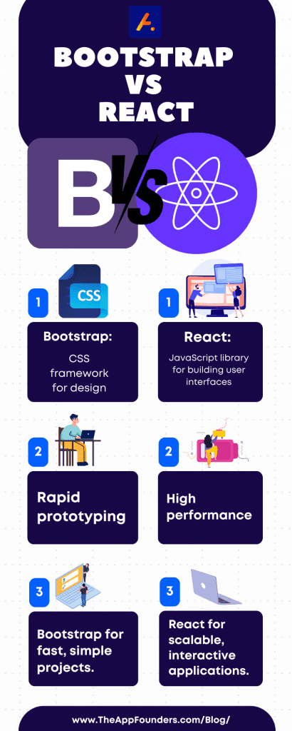 This blog from The App Founder aims to discuss Bootstrap Vs React and compare them through their attributes, functionalities, and core features. We will evaluate these tools on usability, learning curve, customization, flexibility, performance, community support, and more.